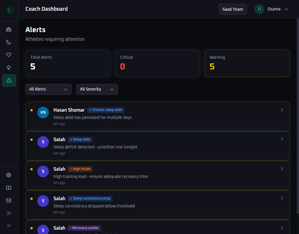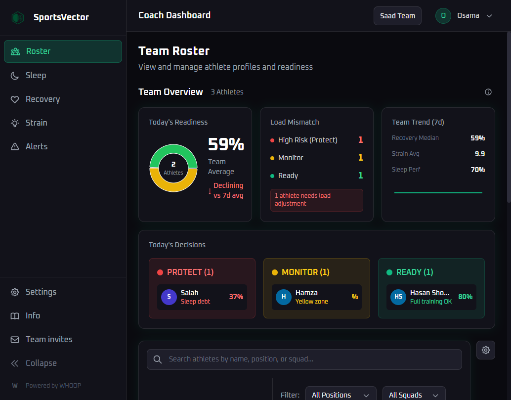 “The roster dashboard saves me 30 minutes every morning. I used to text every player asking how they felt — now the data tells me. My athletes trust the decisions more because they're grounded in their own numbers.”