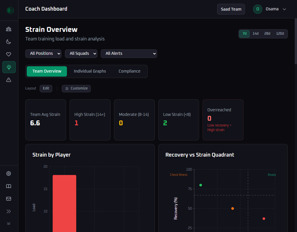 Your dashboard updates every morning with each player's recovery, HRV, and strain score.