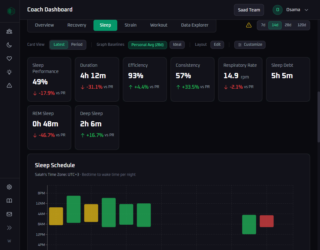 “Seeing my sleep debt visualized made me finally take it seriously. I started sleeping 30 minutes more per night and my coach noticed my practice intensity improve within two weeks. The data doesn't lie.”
